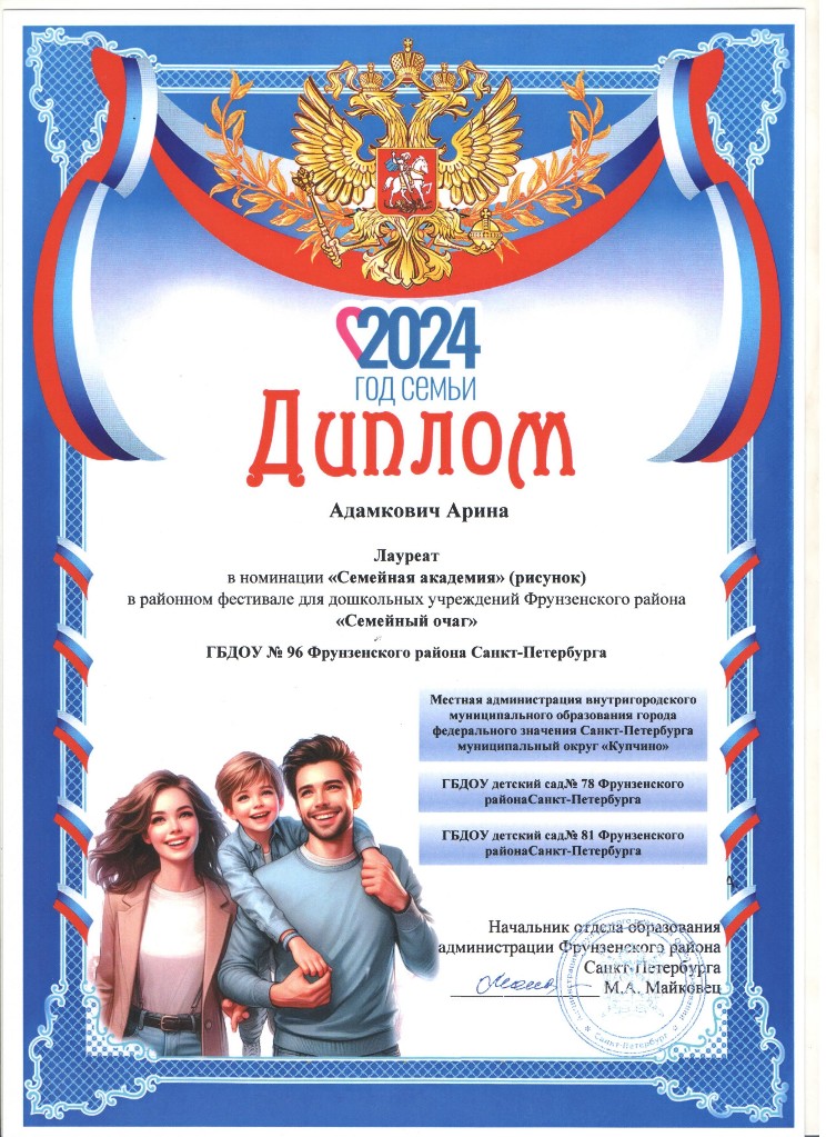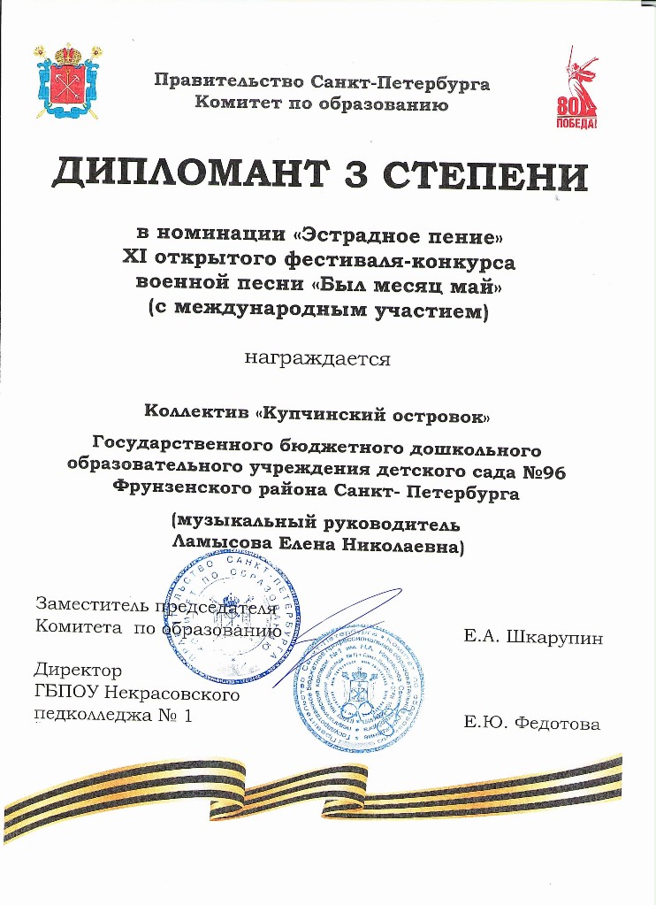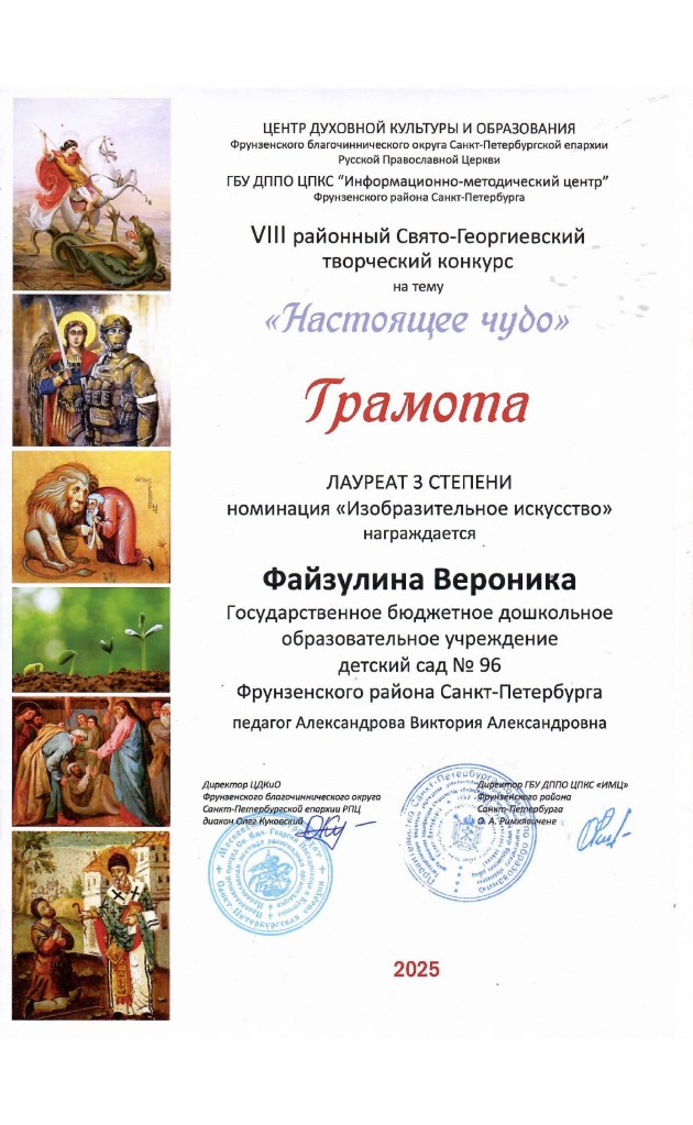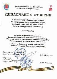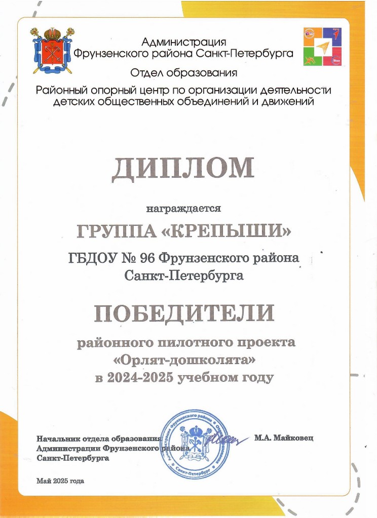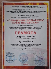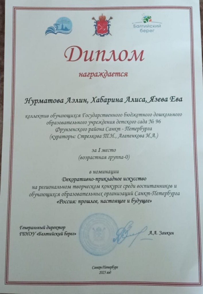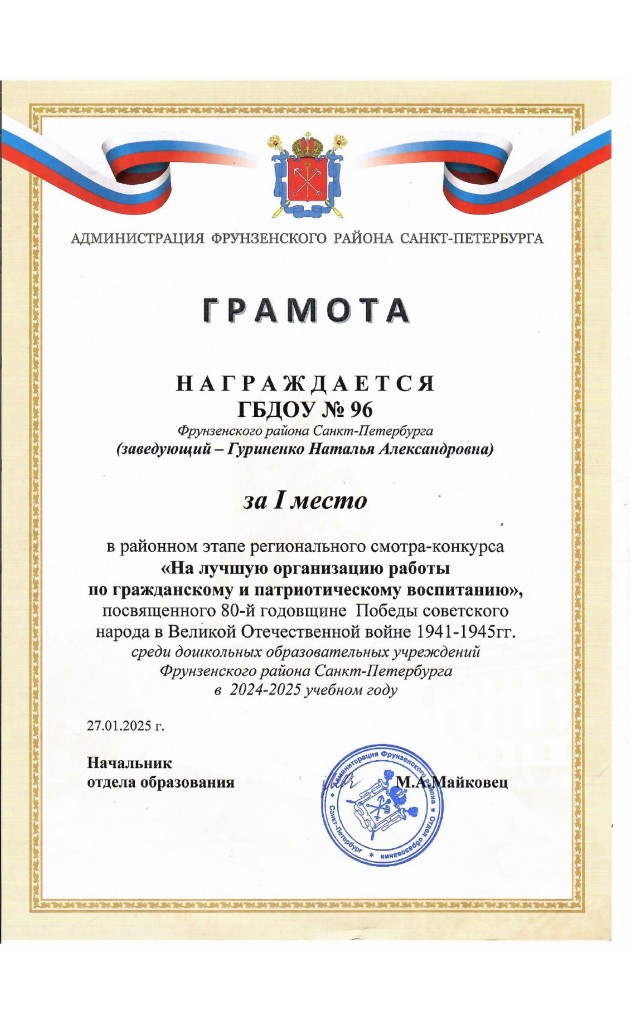 за I место в районном этапе регионального смотра-конкурса «На лучшую организацию работы по гражданскому и патриотическому воспитанию», посвященного 80-й годовщине Победы советского народа в Великой Отечественной войне 1941-1945гг. среди дошкольных образовательных учреждений Фрунзенского района Санкт-Петербурга в 2024-2025 году