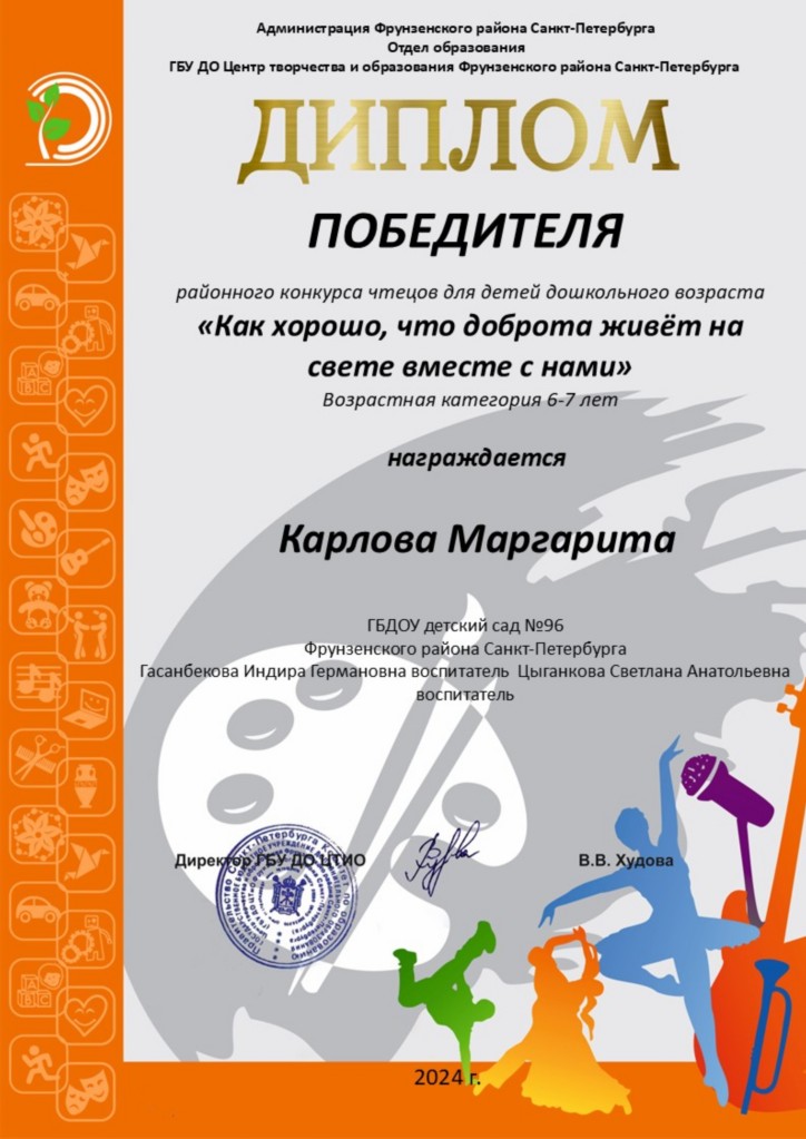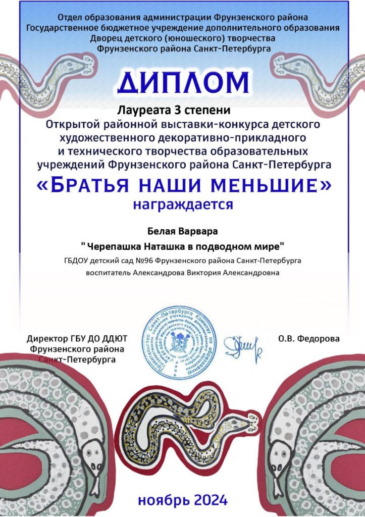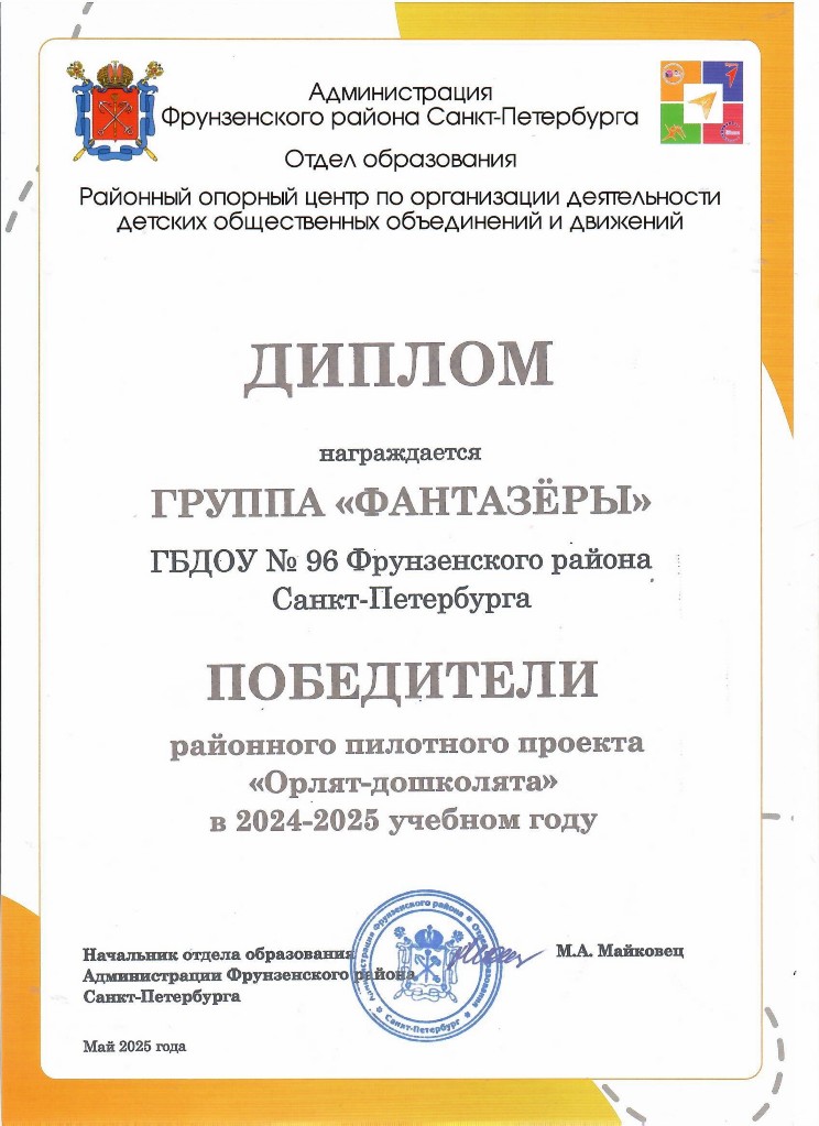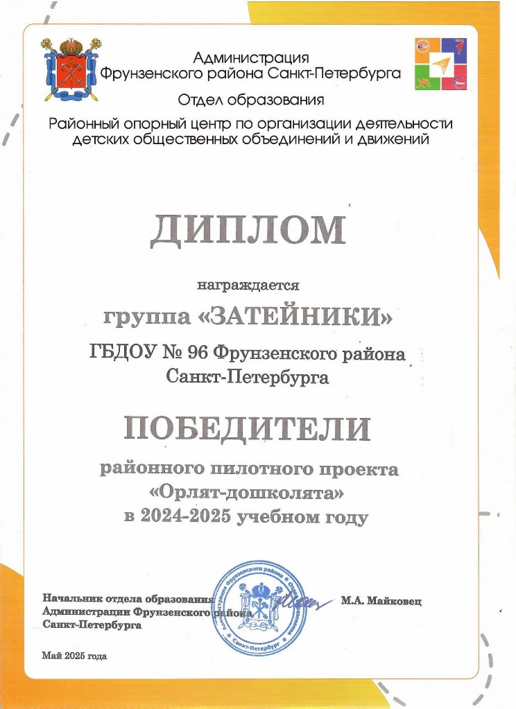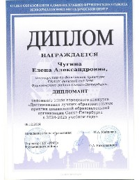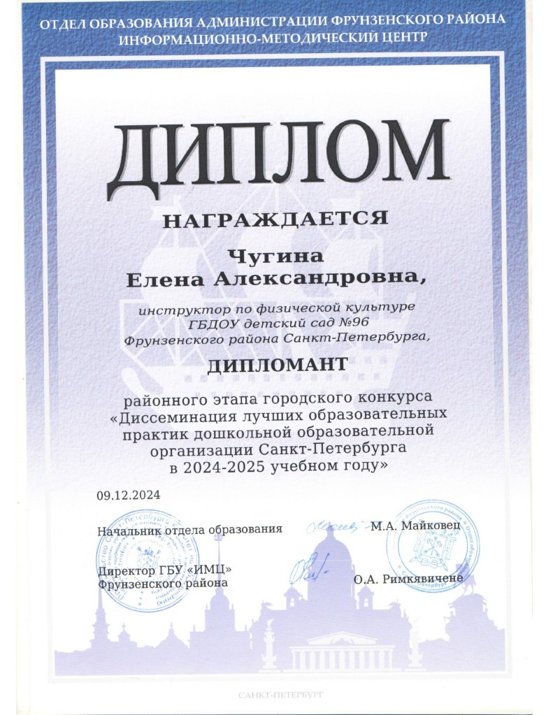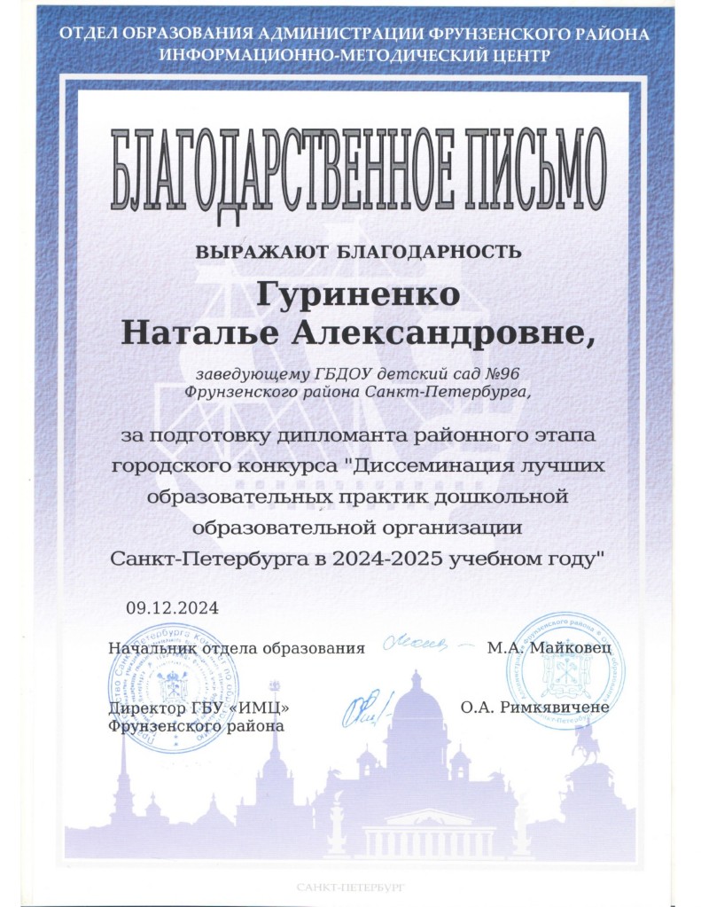за подготовку дипломанта районного конкурса «Диссеминация лучших образовательных практик дошкольной образовательной организации Санкт-Петербурга в 2024-2025 учебном году»