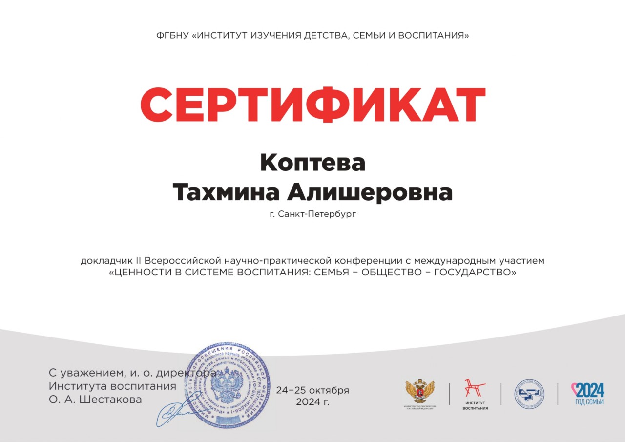 Докладчик II Всероссийской научно-практической конференции с международным участием "Ценности в системе воспитания: семья-общество-государство"