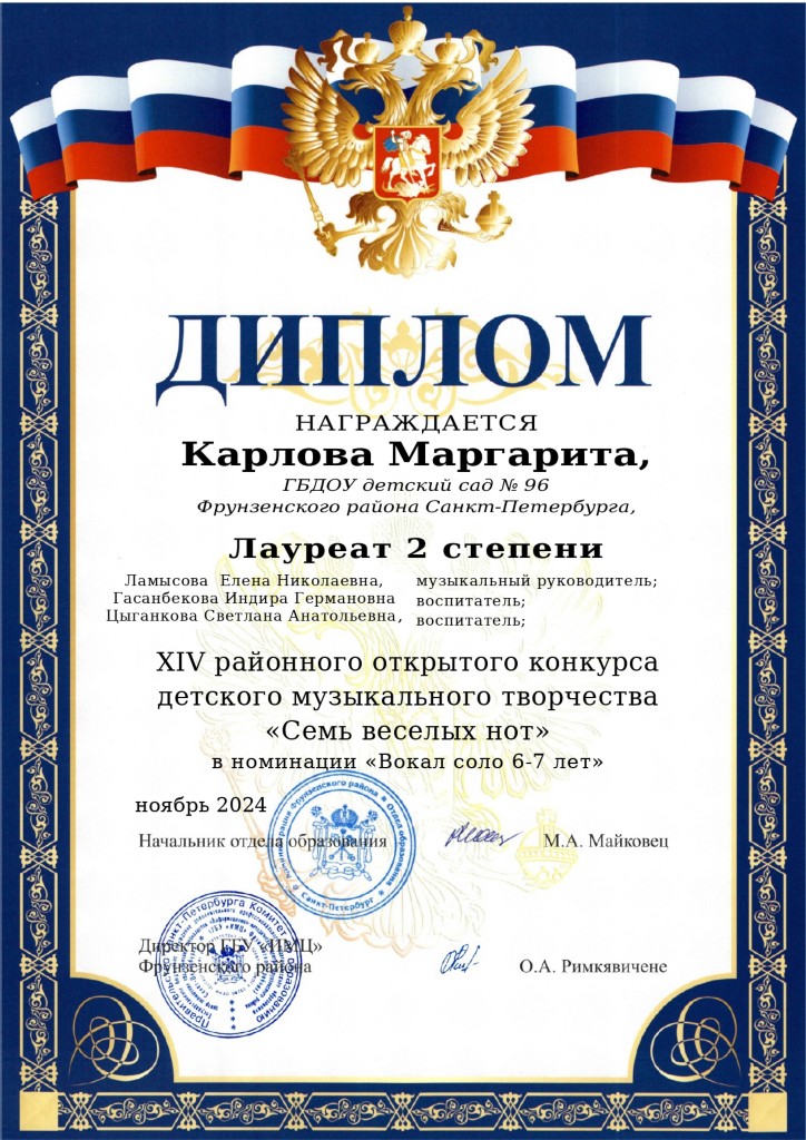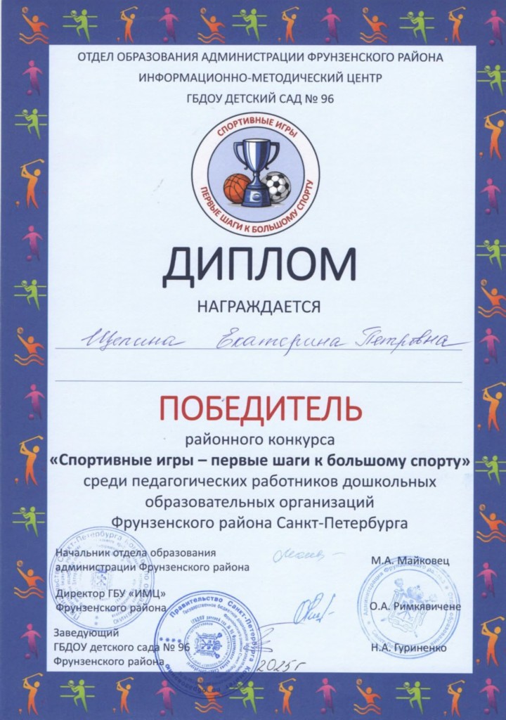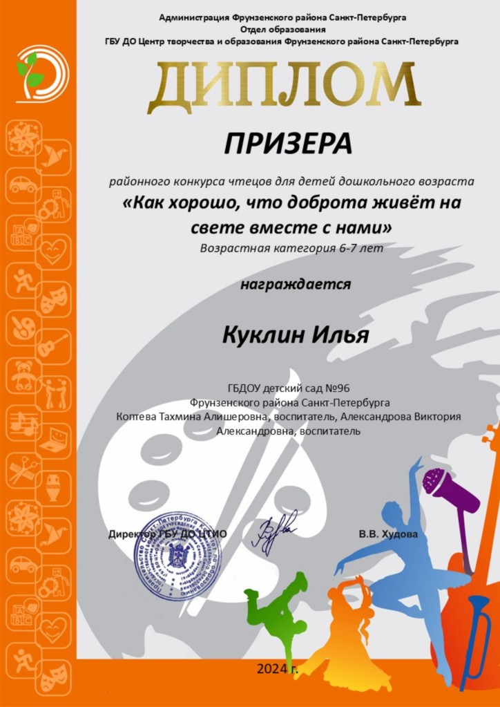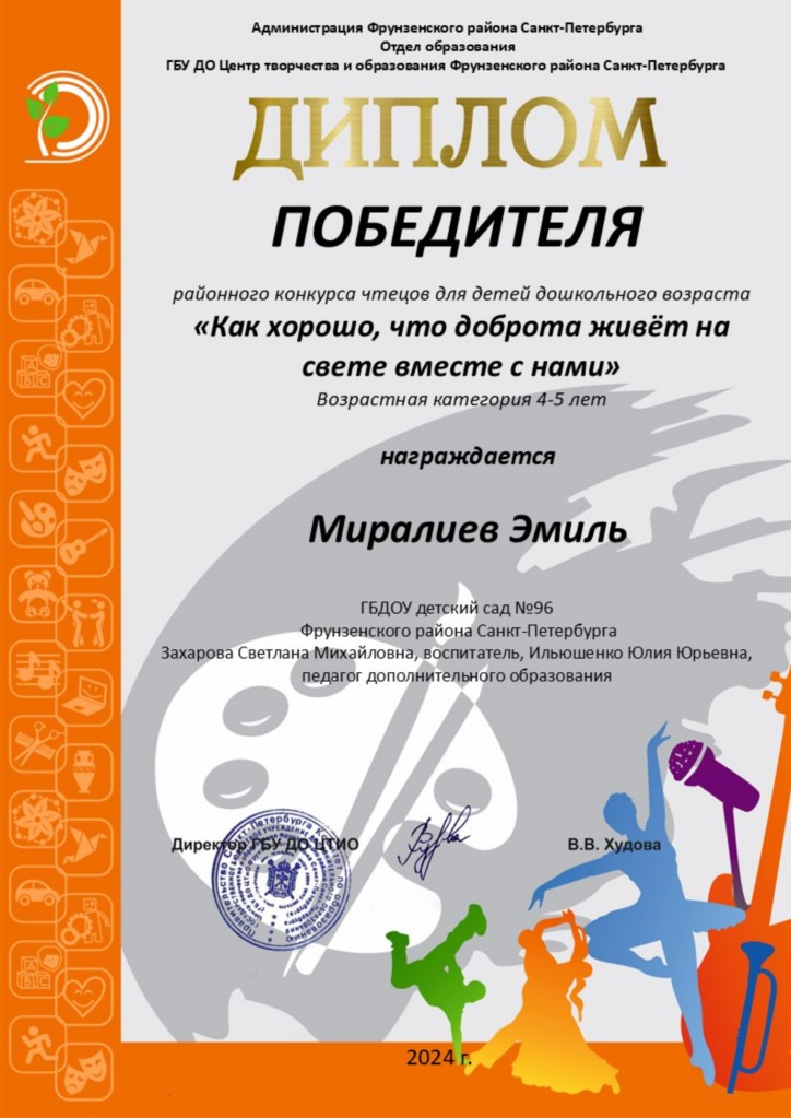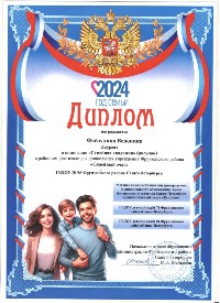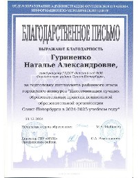за подготовку дипломанта районного конкурса «Диссеминация лучших образовательных практик дошкольной образовательной организации Санкт-Петербурга в 2024-2025 учебном году»