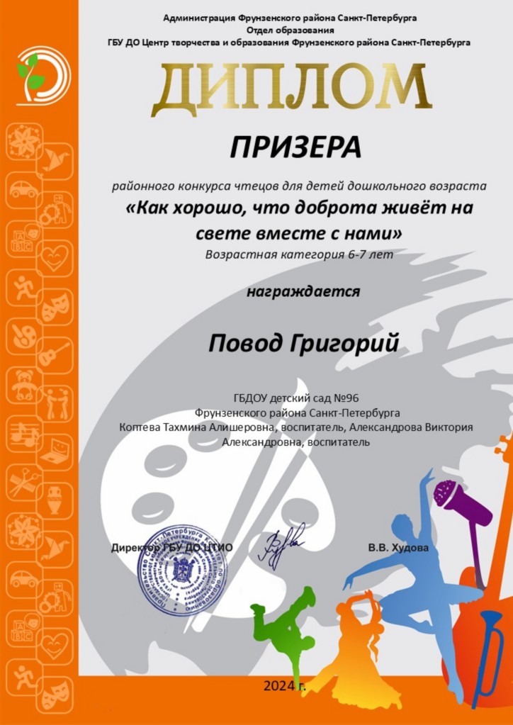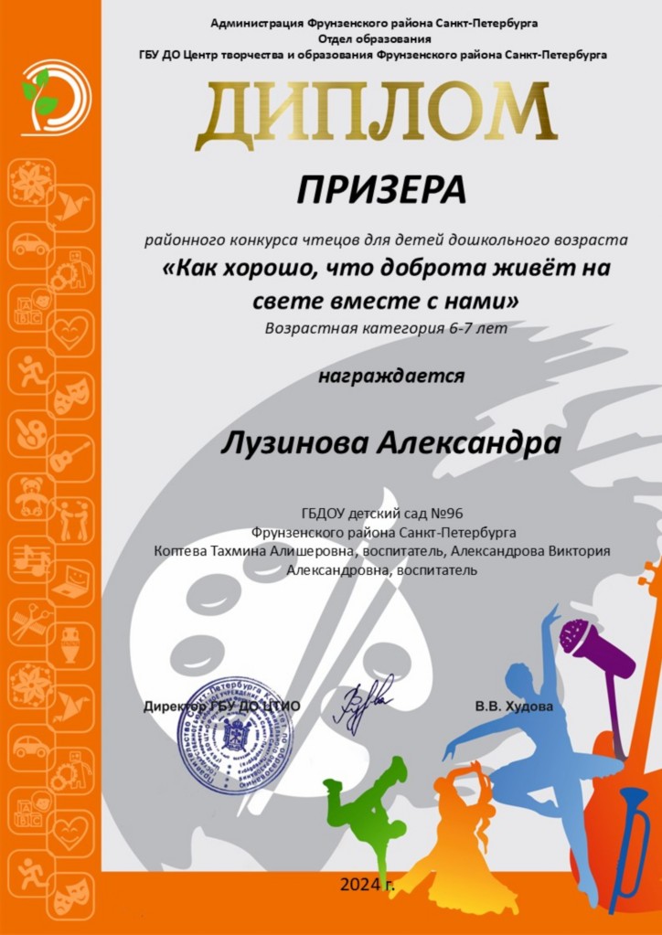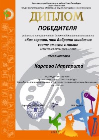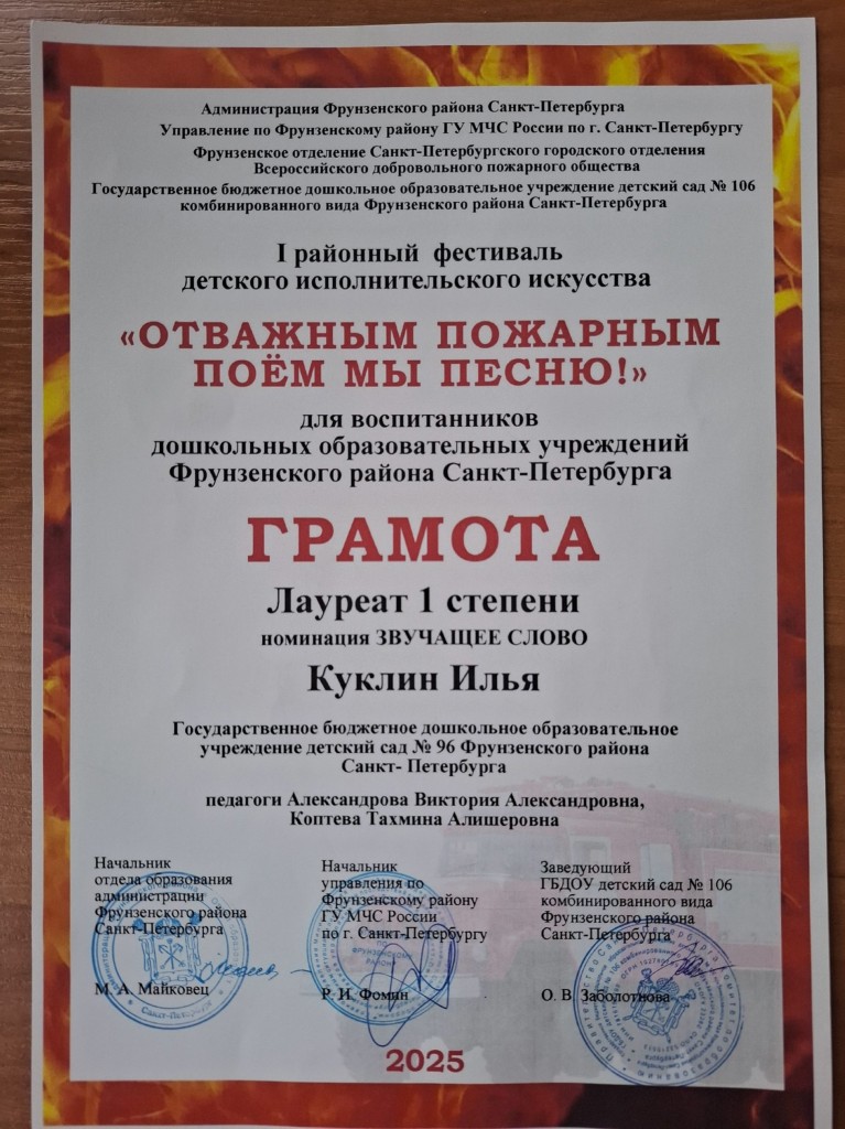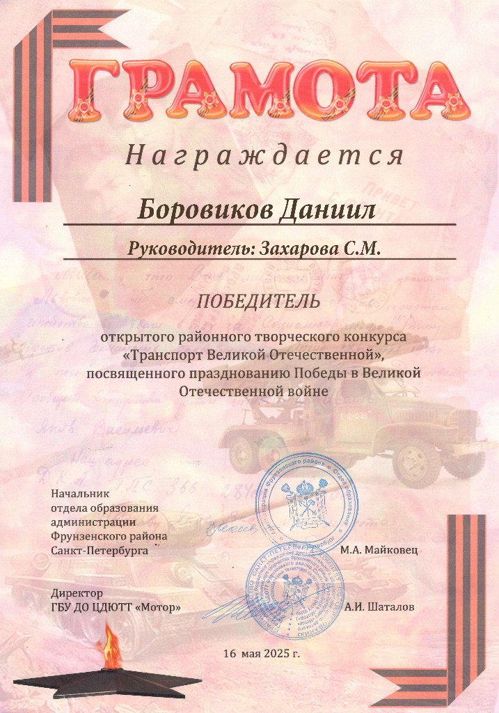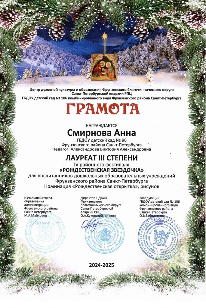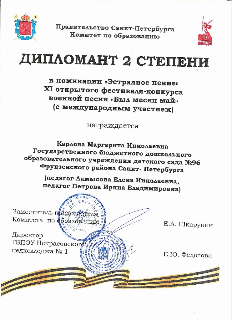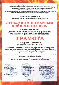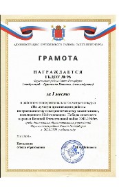 за I место в районном этапе регионального смотра-конкурса «На лучшую организацию работы по гражданскому и патриотическому воспитанию», посвященного 80-й годовщине Победы советского народа в Великой Отечественной войне 1941-1945гг. среди дошкольных образовательных учреждений Фрунзенского района Санкт-Петербурга в 2024-2025 году