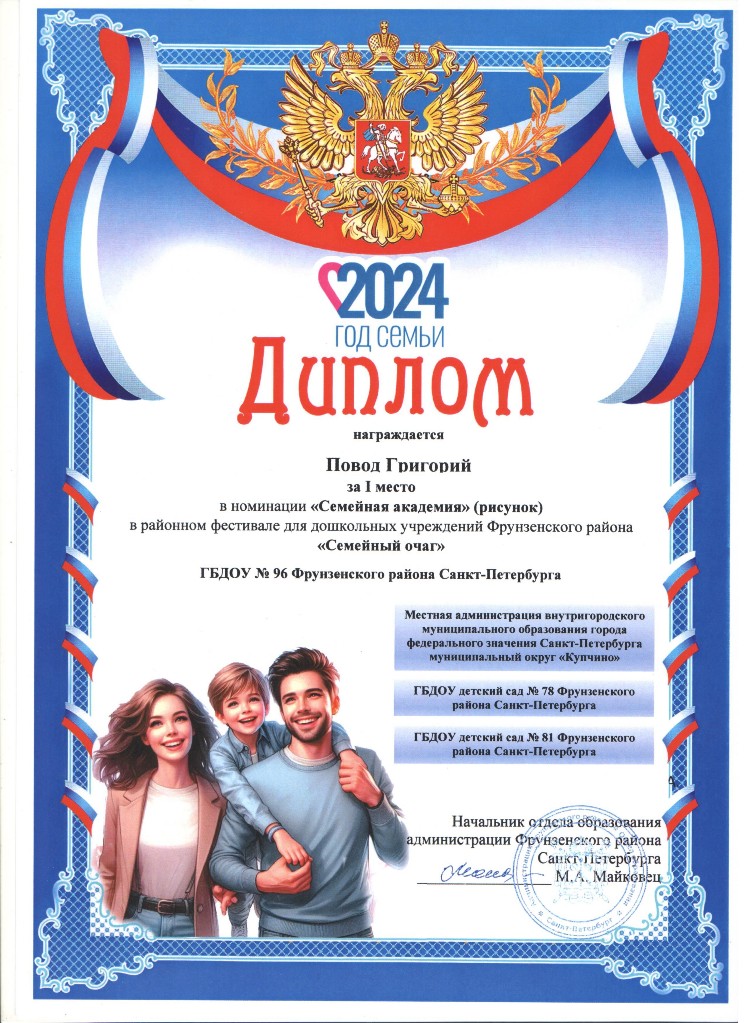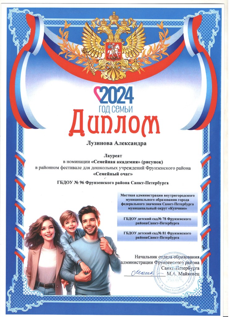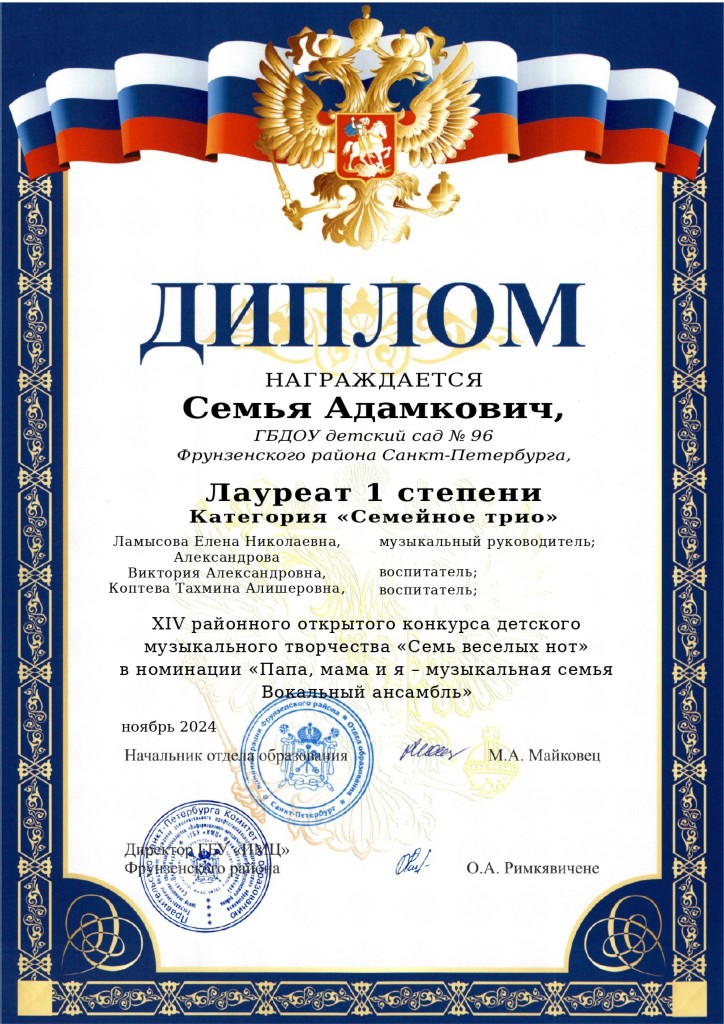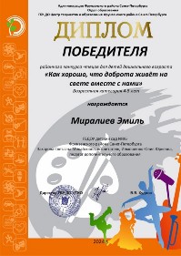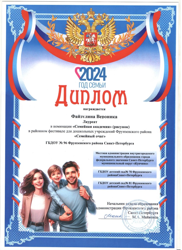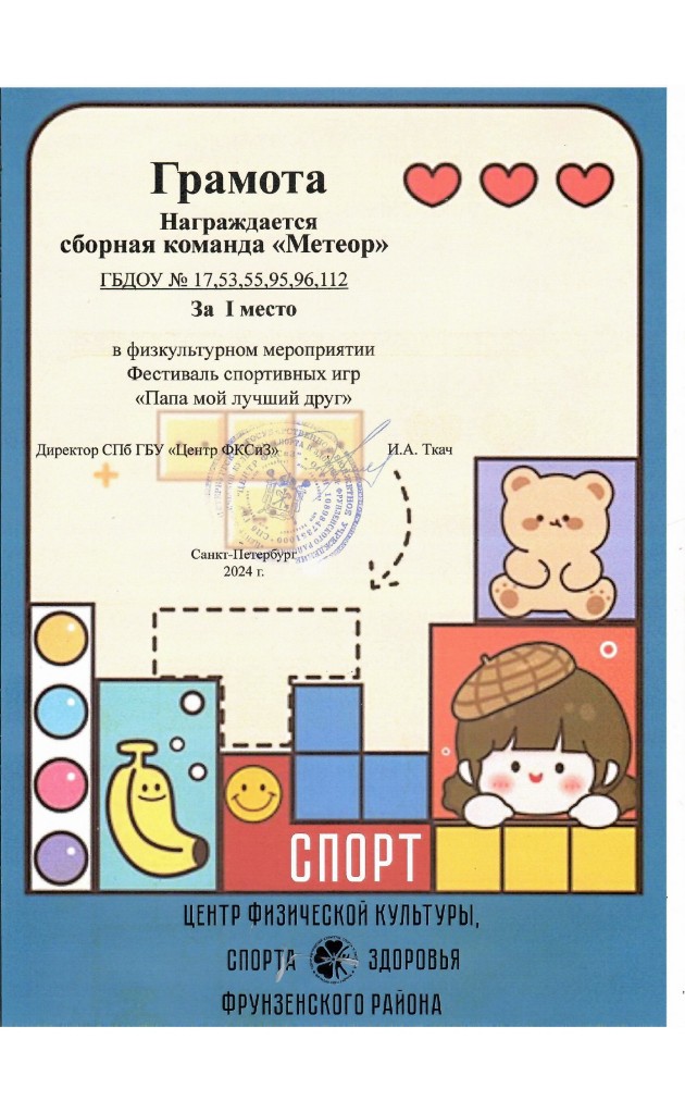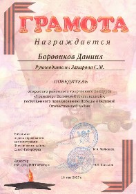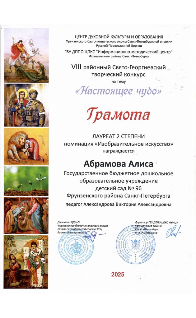 за I место в районном этапе регионального смотра-конкурса «На лучшую организацию работы по гражданскому и патриотическому воспитанию», посвященного 80-й годовщине Победы советского народа в Великой Отечественной войне 1941-1945гг. среди дошкольных образовательных учреждений Фрунзенского района Санкт-Петербурга в 2024-2025 году