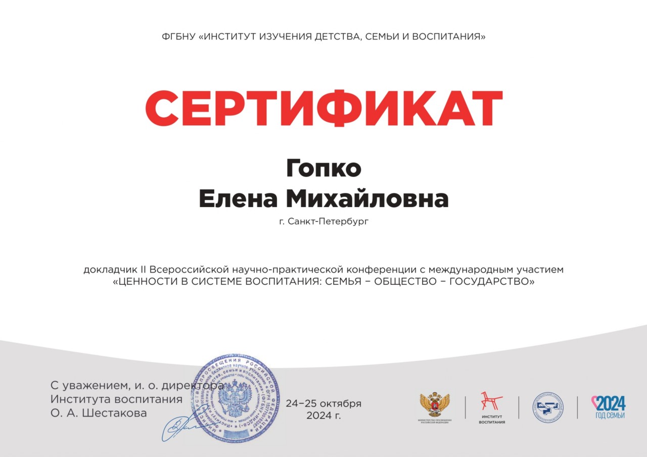 Докладчик II Всероссийской научно-практической конференции с международным участием "Ценности в системе воспитания: семья-общество-государство"